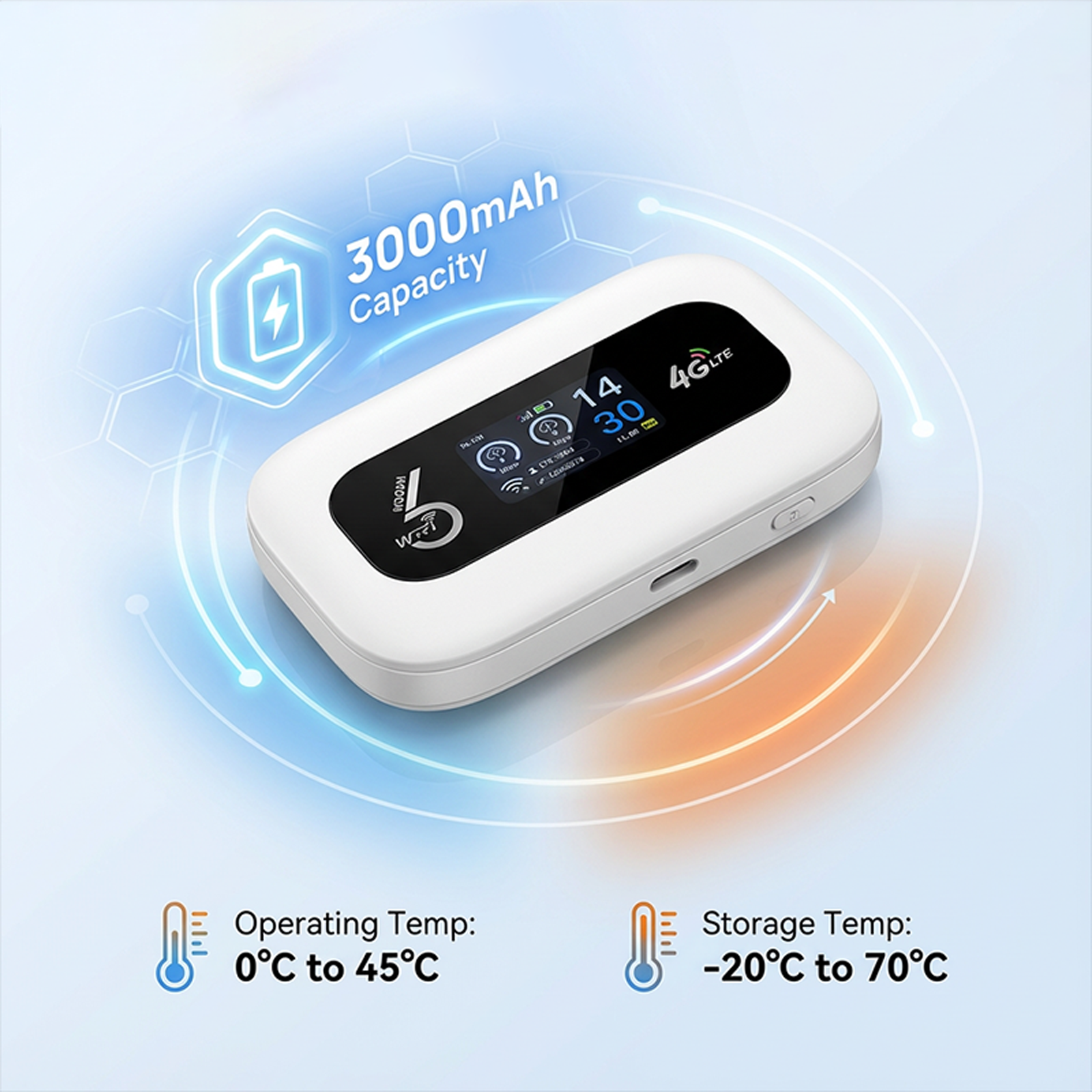 - Long-Lasting Built-In Battery (3000mAh) – Provides extended usage on a single charge, keeping you online during commutes, outdoor activities, or power outages.