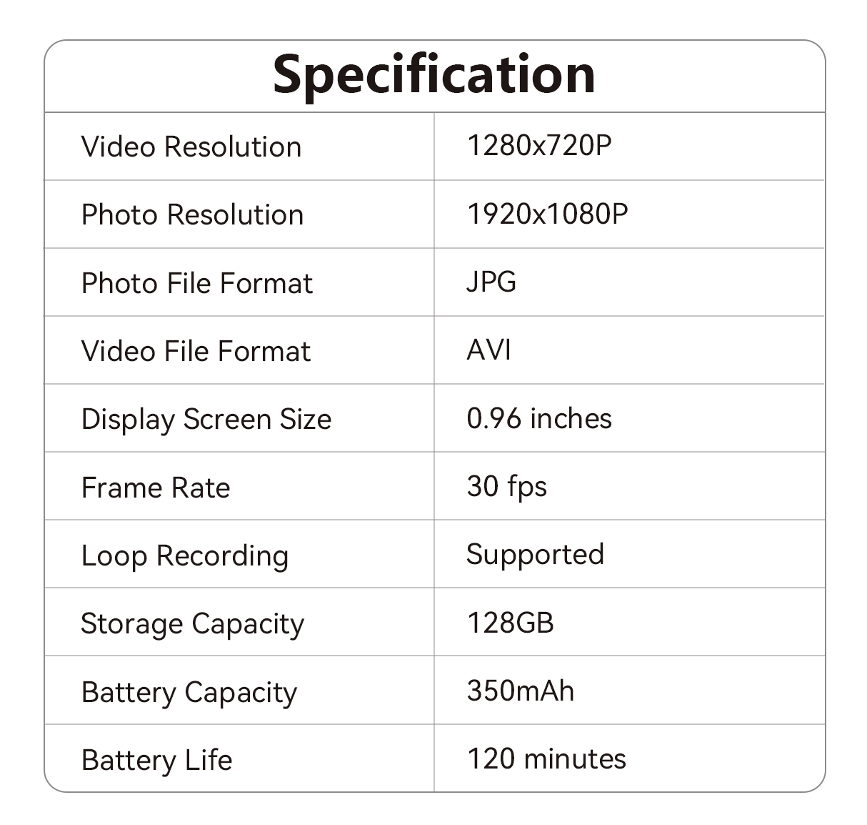 • 120-Minute Battery: A long-lasting battery for continuous recording.